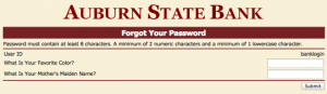 Forgot User ID/Password – Contact the bank’s help line if you can’t remember your User ID and a bank employee will guide you through the process of recovering your ID. Can’t remember your Password? Supply your User ID and answer the two security questions, then click Submit.