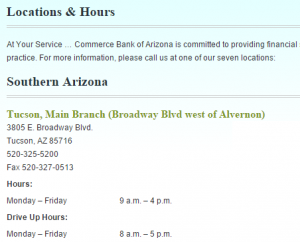 Commerce Bank of Arizona, Inc. provides personal and business banking services in southern Arizona. It offers business deposit and savings, such as business checking, premium business checking, small business checking, neighborhood checking, community checking, business money market, IOLTA (attorney trust accounts), certificate of deposit, and business statement savings accounts.
