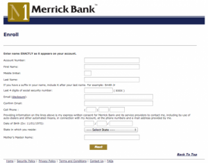 Step 1 – Go to Merrick Bank’s Enrollment Page and enter your account information, then click Next.