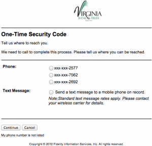 Step 4 – Select which phone number you can be reached by and whether or not you would like a text message, then click Continue to finish the “One-Time Security Code” process to access your account.